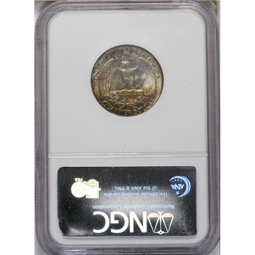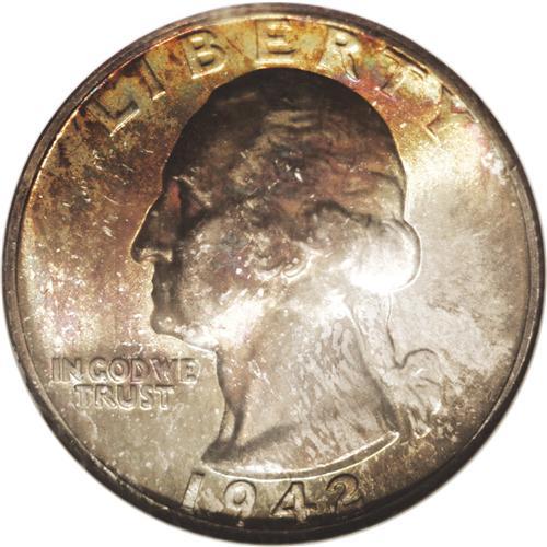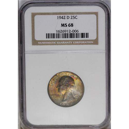 <B>1942-D<25C> MS68 NGC.</B></I> The 1942-D quarter is extremely rare in the lofty grade of MS68. Indeed, only two specimens have been so graded, both by NGC. No examples have been certified at higher grade levels (6/06). The present specimen displays splashes of deep-intensity crimson, gold-orange, cobalt-blue, and gold-brown toning that adhere to radiantly lustrous surfaces. A couple of trivial marks on Washington's portrait are noted, but they in no way detract from the overall marvelous eye appeal generated by this fabulous coin.