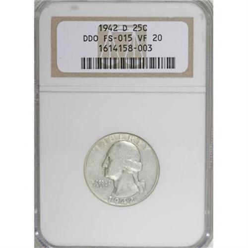 <B>1942-D 25C Doubled Die Obverse VF20 NGC.</B></I> FS-015. NGC Census: (2/923). PCGS Population (1/1015). Mintage: 17,487,200. Numismedia Wsl. Price for NGC/PCGS coin in VF20: $2.90. (#5818)<BR><BR><B>Coin Engraver:</B> John Flanagan<BR><BR><b>Shipping:</b> Coins & Currency (<a target="_blank" href="http://www.heritageauctions.com/common/shipping.php">view shipping information</a>)