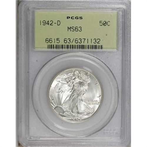 <B>1942-D 50C MS63 PCGS.</B></I> PCGS Population (507/4927). NGC Census: (196/2912). Mintage: 10,973,800. Numismedia Wsl. Price for NGC/PCGS coin in MS63: $78. (#6615)<BR><BR><B>Coin Engraver:</B> Adolph A. Weinman<BR><BR><b>Shipping:</b> Coins & Currency (<a target="_blank" href="http://www.heritageauctions.com/common/shipping.php">view shipping information</a>)