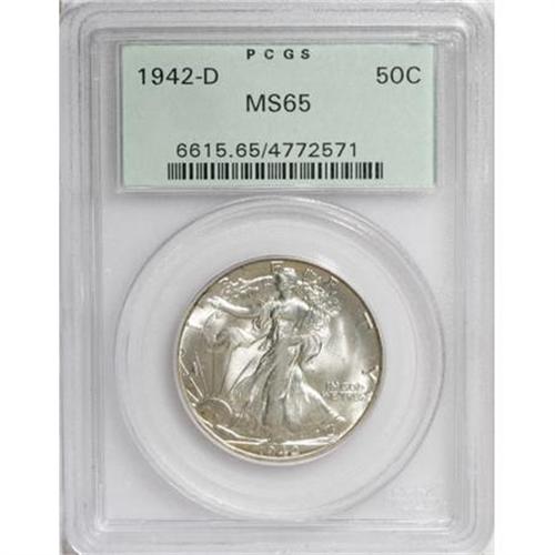 <B>1942-D 50C MS65 PCGS.</B></I> PCGS Population (2329/1061). NGC Census: (1294/878). Mintage: 10,973,800. Numismedia Wsl. Price for NGC/PCGS coin in MS65: $280. (#6615)<BR><BR><B>Coin Engraver:</B> Adolph A. Weinman<BR><BR><b>Shipping:</b> Coins & Currency (<a target="_blank" href="http://www.heritageauctions.com/common/shipping.php">view shipping information</a>)