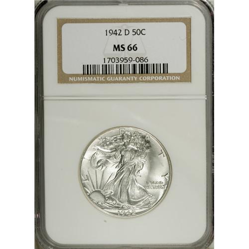 <B>1942-D 50C MS66 NGC.</B></I> A well struck and brilliant Premium Gem that has only tiny ticks in the fields. One of the best-preserved survivors from an original mintage of over 10 million pieces.<BR><BR><b>Shipping:</b> Coins & Currency (<a target="_blank" href="http://www.heritageauctions.com/common/shipping.php">view shipping information</a>)