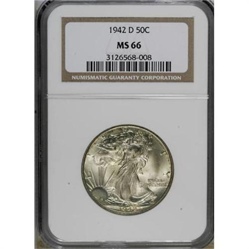 <B>1942-D 50C MS66 NGC.</B></I> NGC Census: (764/114). PCGS Population (947/114). Mintage: 10,973,800. Numismedia Wsl. Price for NGC/PCGS coin in MS66: $310. (#6615)<BR><BR><B>Coin Engraver:</B> Adolph A. Weinman<BR><BR><b>Shipping:</b> Coins & Currency (<a target="_blank" href="http://www.heritageauctions.com/common/shipping.php">view shipping information</a>)