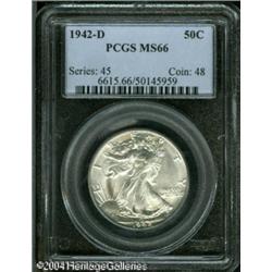 1942-D 50C MS66 PCGS. Bright lustrous surfaces rev <B>1942-D 50C MS66 PCGS.</B></I> Bright lustrous surfaces reveal just a hint of color over parts of the reverse. Impeccably preserved, and well struck. <BR><BR><B>Important notice:</B> Heritage usually auctions material at the rate of 200-250 lots per hour. On some occasions eBay Live bid software or the Internet may not be able to keep up with the pace of the auction. We recommend placing a realistic absentee bid now as insurance to avoid disappointment. Occasionally the auctioneer may eliminate or reject an eBay Live bid, and the auctioneer may also reopen a lot after the close of the eBay live bidding (usually because we missed an audience bid), and may reject your bid even if it shows you as the winning bidder. By bidding via eBay Live, you agree that Heritage may award the lot to another bidder at its sole discretion under the circumstances described above or any other reasonable circumstances. Since eBay bids are not shown to us until we open the lot on the floor, we treat those bids just like floor bids. In most cases the floor responds before the eBay bid is presented to us, due to Internet lag time, so for consistency we have made it a policy that floor bids are always considered first over tie eBay live bids. Also please note that all Heritage lots purchased through eBay Live carry a 20% Buyer's Premium. Please make sure you read the Terms and Conditions before you bid. This lot is being auctioned in conjunction with a live floor auction by Heritage Galleries & Auctioneers. All final auction and invoice information will be supplied by Heritage Galleries & Auctioneers, and all other information should be considered preliminary. Lot:6226