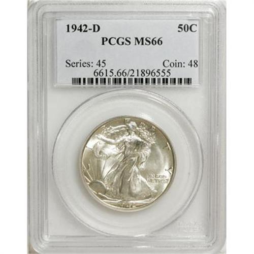 <B>1942-D 50C MS66 PCGS.</B></I> PCGS Population (927/114). NGC Census: (749/114). Mintage: 10,973,800. Numismedia Wsl. Price for NGC/PCGS coin in MS66: $300. (#6615)<BR><BR><B>Coin Engraver:</B> Adolph A. Weinman<BR><BR><b>Shipping:</b> Coins & Currency (<a target="_blank" href="http://www.heritageauctions.com/common/shipping.php">view shipping information</a>\)