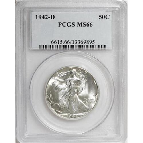 <B>1942-D 50C MS66 PCGS.</B></I> PCGS Population (947/114). NGC Census: (764/114). Mintage: 10,973,800. Numismedia Wsl. Price for NGC/PCGS coin in MS66: $310. (#6615)<BR><BR><B>Coin Engraver:</B> Adolph A. Weinman<BR><BR><b>Shipping:</b> Coins & Currency (<a target="_blank" href="http://www.heritageauctions.com/common/shipping.php">view shipping information</a>)