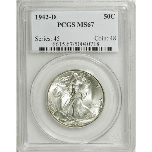 <B>1942-D 50C MS67 PCGS.</B></I> A highly lustrous and suitably impressed Superb Gem that borders on full brilliance. Immensely appealing. PCGS has graded just four coins finer (1/07).<BR><BR><b>Shipping:</b> Coins & Currency (<a target="_blank" href="http://www.heritageauctions.com/common/shipping.php">view shipping information</a>)