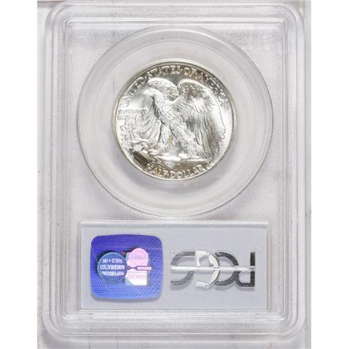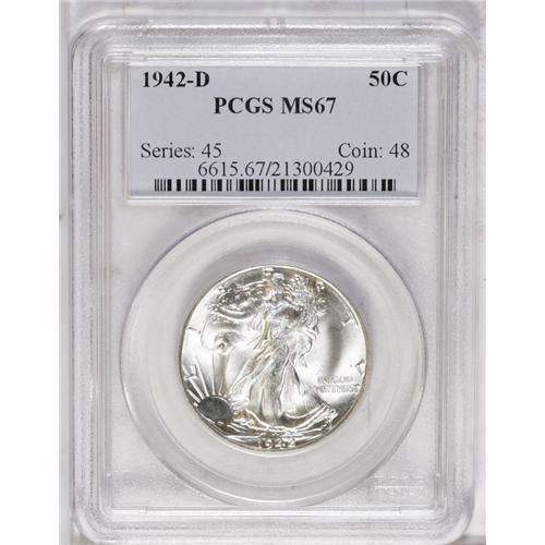 <B>1942-D<50C> MS67 PCGS.</B></I> The devices exhibit moderate frost on the obverse, while the reverse devices do not. The luster is satiny with patches of brilliance, possibly from freshly-polished dies.<BR><I>From The Chicago-Ark Collection.</B></I>
