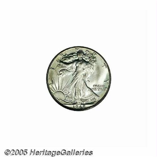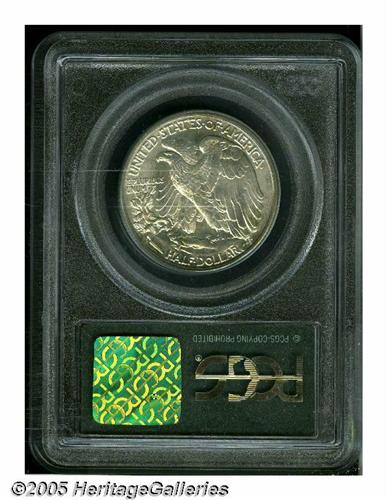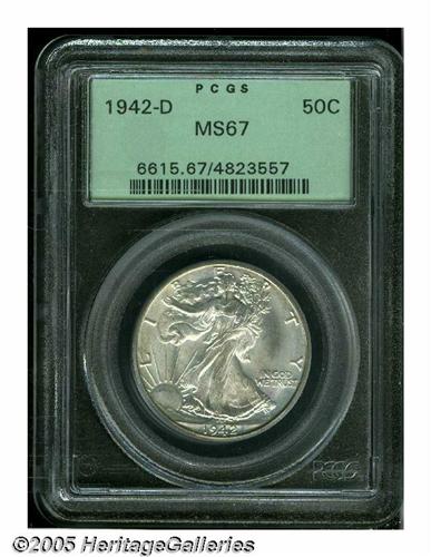 <B>1942-D<50C> MS67 PCGS.</B></I> This is a splendid Gem with satiny silver luster beneath pale blue toning. Hints of iridescence may be seen on both sides. Population: 105 in 67, 4 finer (6/05).<BR><I>From The Robert Moreno Collection.</B></I>