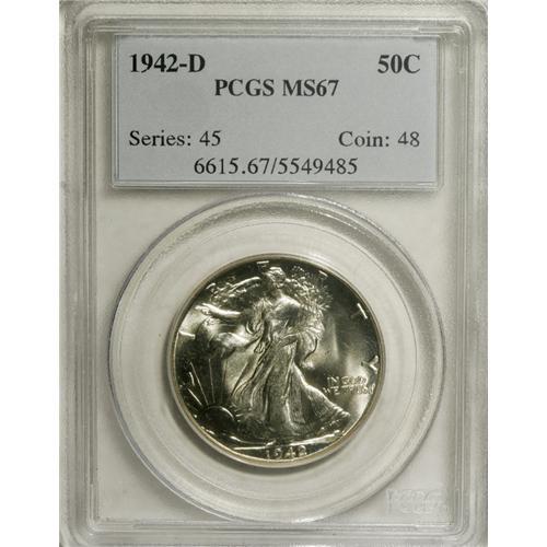 <B>1942-D 50C MS67 PCGS.</B></I> This well-defined and highly lustrous Superb Gem has remarkable eye appeal. The fields have a hint of pale gold and blue patina over each side.<BR><BR><b>Shipping:</b> Coins & Currency (<a target="_blank" href="http://www.heritageauctions.com/common/shipping.php">view shipping information</a>)
