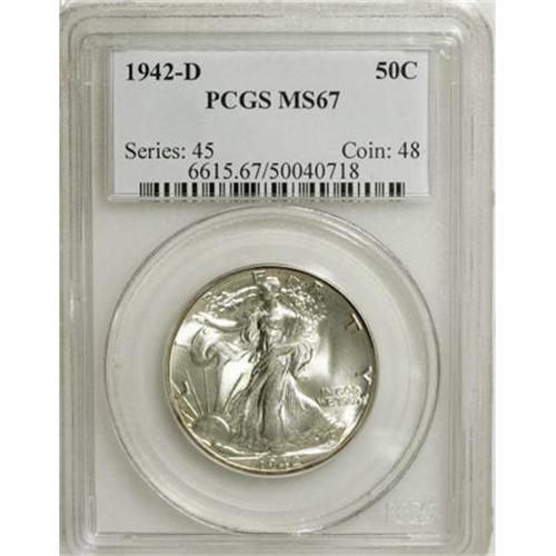 <B>1942-D 50C MS67 PCGS.</B></I> PCGS Population (110/4). NGC Census: (111/3). Mintage: 10,973,800. Numismedia Wsl. Price for NGC/PCGS coin in MS67: $900. (#6615)<BR><BR><B>Coin Engraver:</B> Adolph A. Weinman<BR><BR><b>Shipping:</b> Coins & Currency (<a target="_blank" href="http://www.heritageauctions.com/common/shipping.php">view shipping information</a>\)