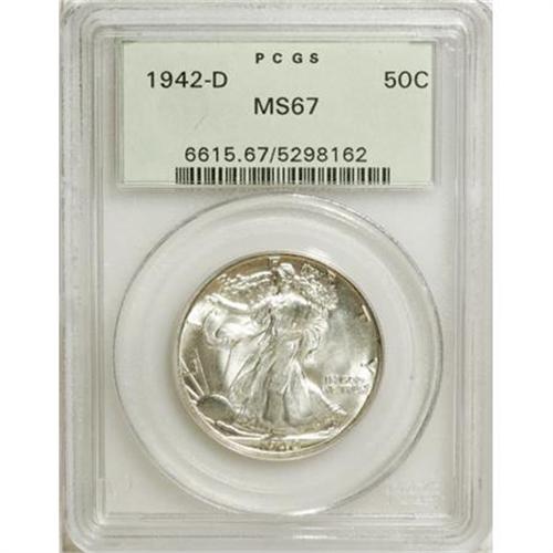<B>1942-D 50C MS67 PCGS.</B></I> PCGS Population (110/4). NGC Census: (111/3). Mintage: 10,973,800. Numismedia Wsl. Price for NGC/PCGS coin in MS67: $900. (#6615)<BR><BR><B>Coin Engraver:</B> Adolph A. Weinman<BR><BR><b>Shipping:</b> Coins & Currency (<a target="_blank" href="http://www.heritageauctions.com/common/shipping.php">view shipping information</a>\)
