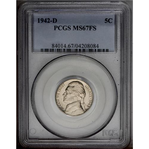 <B>1942-D<5C> MS67 Full Steps PCGS.</B></I> Essentially untoned surfaces display great luster and exceptionally well struck devices. Nicely preserved throughout. Population: 38 in 67, 0 finer (3/06). <BR><BR><B>Important notice:</B> Heritage usually auctions material at the rate of 200-250 lots per hour. On some occasions eBay Live bid software or the Internet may not be able to keep up with the pace of the auction. We recommend placing a realistic absentee bid now as insurance to avoid disappointment. Occasionally the auctioneer may eliminate or reject an eBay Live bid, and the auctioneer may also reopen a lot after the close of the eBay live bidding (usually because we missed an audience bid), and may reject your bid even if it shows you as the winning bidder. By bidding via eBay Live, you agree that Heritage may award the lot to another bidder at its sole discretion under the circumstances described above or any other reasonable circumstances. Since eBay bids are not shown to us until we open the lot on the floor, we treat those bids just like floor bids. In most cases the floor responds before the eBay bid is presented to us, due to Internet lag time, so for consistency we have made it a policy that floor bids are always considered first over tie eBay live bids. Also please note that all Heritage lots purchased through eBay Live carry a 20% Buyer's Premium. Please make sure you read the Terms and Conditions before you bid. This lot is being auctioned in conjunction with a live floor auction by Heritage Galleries & Auctioneers. All final auction and invoice information will be supplied by Heritage Galleries & Auctioneers, and all other information should be considered preliminary. Lot:1162 <BR><BR><B>Winning Notification and Billing:</B> After the FINAL session in this auction is complete, Heritage will send e-mail and snail mail invoices. This process normally takes several days. All final auction and invoice information will be supplied by Heritage Galleries & Auctioneers, and all other information should be considered preliminary. <BR><BR>This auction will be conducted on a live auction floor and over the Internet through eBay Live. If you choose to place an absentee bid, please take a moment to <font color='#0000ff'><u><a href='http://pages.ebay.com/liveauctions/help/before/laabsentee.html'>learn how eBay Live absentee bidding works</a></u></font><font color='#000000'>