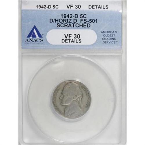 <B>1942-D Over Horizontal D 5C --Scratched--ANACS. VF30 Details.</B></I> FS-501. NGC Census: (3/659). PCGS Population (2/587). Mintage: 13,938,000. Numismedia Wsl. Price for NGC/PCGS coin in VF30: $1. (#4014)<BR><BR><B>Coin Engraver:</B> Felix Schlag<BR><BR><b>Shipping:</b> Coins & Currency (<a target="_blank" href="http://www.heritageauctions.com/common/shipping.php">view shipping information</a>)