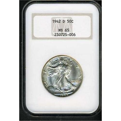 <b>1942-D Liberty Walking Half Dollar. NGC graded MS65.</b> Bright silver color bursts from original surfaces unmarred by toning. A strong strike as well, making this a desirable specimen <b>(PCGS # 6615)</b>