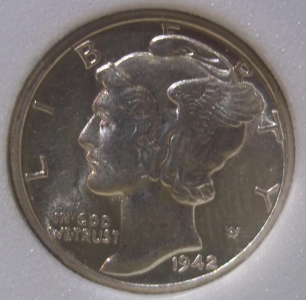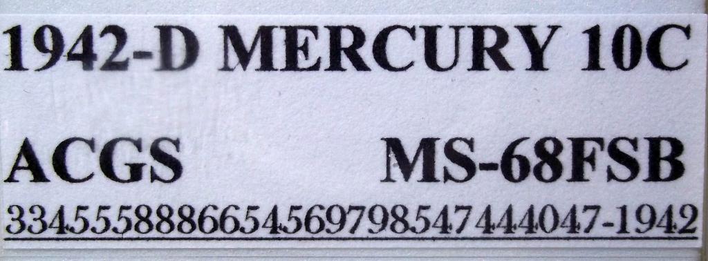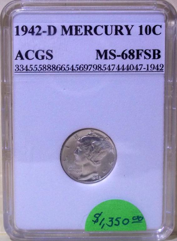 1942 Denver Mint Mercury Dime, certified and graded Mint State 68 Full Split Bands by ACGS! Only the first strike coins have the coveted Full Split Bands reverse, and they sell for many times the price of more common strikes. The Dimes featured today are all from the estate of a fanatic collector who ONLY accepted the very highest grade coins available. The widow has NO INTEREST WHAT SO EVER in coin collecting, and she wants them GONE!