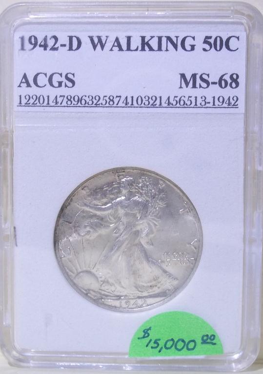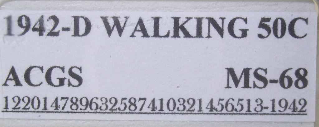 Amazing 1942 Denver Mint Walking Liberty Half Dollar, certified and graded Mint State 68 by ACGS! Walkers are one of the HOTTEST coins in the collector market today, and coins in the higher end Mint State grades are ON FIRE!! A tremendous opportunity for a smart investor!