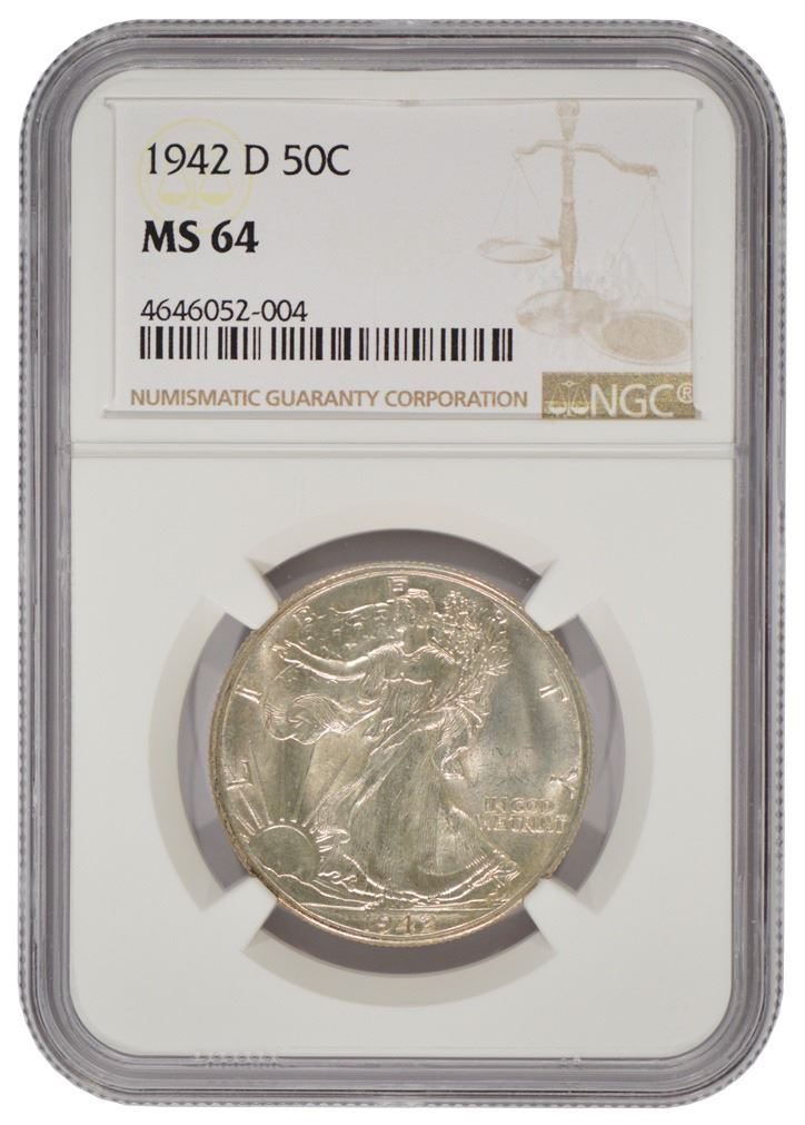 One 1942-D Walking Liberty Half Dollar Coin NGC MS64.