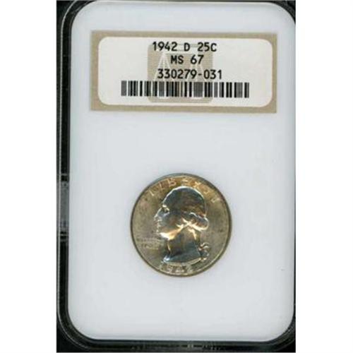 <b>1942-D Washington Quarter Dollar. NGC graded MS67.</b> Incredible silvery perfection in the devices and fields with a touch of patina increasing the eye-appeal <b>(PCGS # 5818)</b>