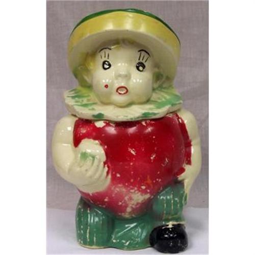 THIS IS A 1942 FRUIT BOY COOKIE JAR.HIS COLORS ARE GREEN,YELLOW,RED,WHITE AND BLACK.IT WAS PAINTED WITH COLD PAINT AND THAT IS THE REASON FOR THE CHIPPED PAINT LOOK. HE REALLY HAS TWO VERY TINY CHIPS ON THE INSIDE OF THE TOP.THIS COOKIE JAR WAS OFTEN SEEN WITH PEE DEE KIDS.THIS IS AN UNUSUAL COOKIE JAR, YOU COOKIE JAR COLLECTOR'S CHECK IT OUT!!!