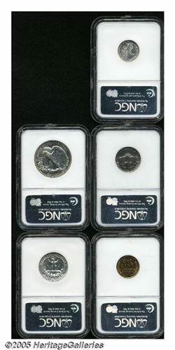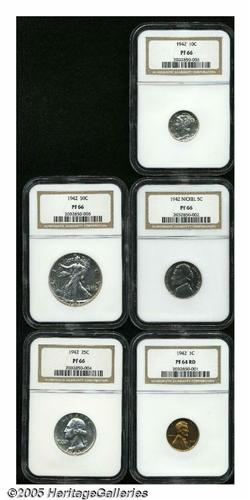 <B>1942 Five Piece Proof Set PR64 to PR66 NGC.</B></I> The set includes: <B>Cent<1C> PR64 Red,</B></I> peach and sky-blue color with a streak of darker hue on UNITED; <B>Type One Nickel PR66,</B></I> well struck, attractive lilac and straw-gold toning; <B>Dime PR66,</B></I> wisps of honey color invigorate the fields, fully struck; <B>Quarter PR66,</B></I> outstanding save for a mark near the right (facing) wingtip; and a <B>Half Dollar PR66,</B></I> lightly toned and prominently mirrored, a bold strike.<BR><I>From the Dr. Kurt Peters Collection.</B></I> From the Dr. Kurt Peters Collection.