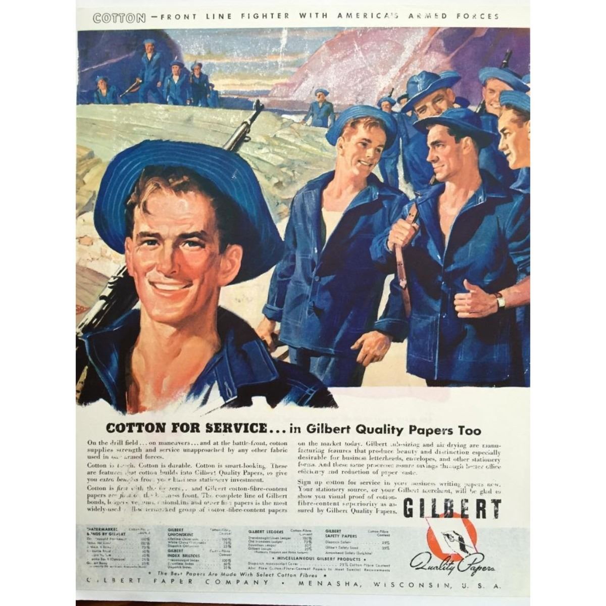 Original 1942 magazine advertisement for Gilbert Quality Papers. Features armed servicemen, with a slogan that reads, "COTTON FOR SERVICE...in Gilbert Quality Papers Too." & COTTON - Front Line Fighter with