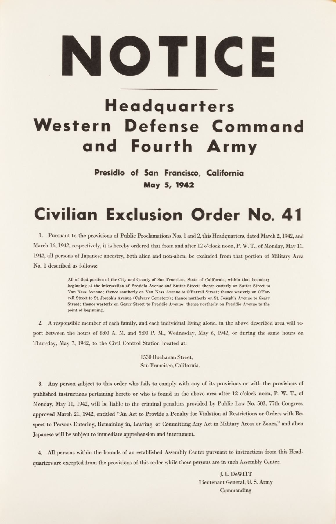 Rare American WWII public announcement broadside, 22 x 14 inches, issued by the Western Defense Command and Fourth Army Wartime Civil Control Administration, Presidio of San Franciso, California. About 120,000 people of Japanese ancestry, most of whom lived on the Pacific Coast, were forcibly relocated and incarcerated in concentration camps in the western interior of the country. Approximately two-thirds of the internees were United States citizens. These actions were ordered by President Franklin D. Roosevelt shortly after the attack on Pearl Harbor. EXCLUSION ORDER - 'NOTICE Headquarters Western Defense Command and Fourth Army Presidio of San Francisco, California, May 5, 1942. 'Pursuant to...Public Proclamations Nos. 1 and 2, this Headquarters, dated March 2, 1942, and March 16, 1942, respectively, it is hereby ordered that from 12 o'clock noon, P.W.T., of Monday, May 11, 1942, all persons of Japanese ancestry, both alien and non-alien, be excluded from that position of Military Area No. 1...Any person...who fails to comply...will be subject to immediate apprehension and internment...', signed in print J.L. DeWitt, Lt. General, US Army. Very good condition.