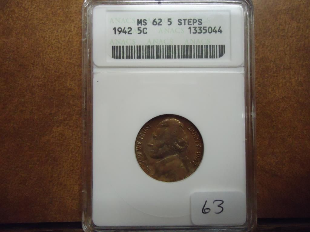 1942 JEFFERSON NICKEL ANACS MS62 5 STEPS