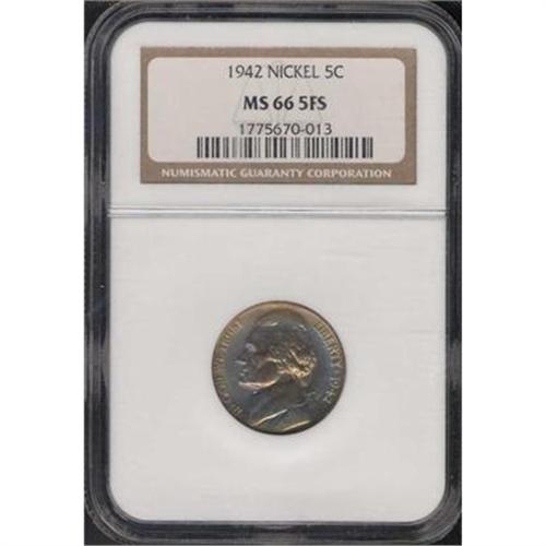 <b>1942 Jefferson Nickel. Type 1. NGC graded MS66 5FS.</b> Exquisite blue and gold toning on this well preserved Type 1 nickel of the second world war period <b>(PCGS # 4013)</b>