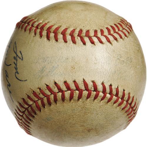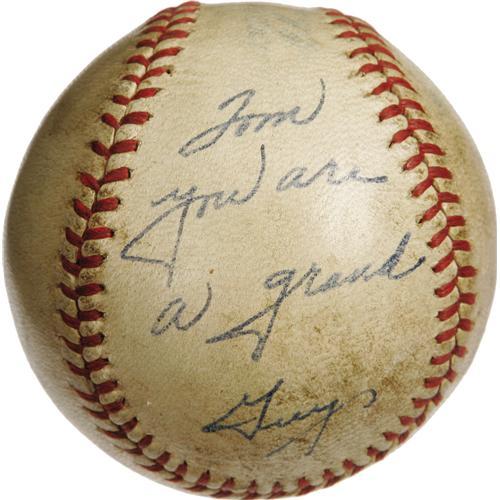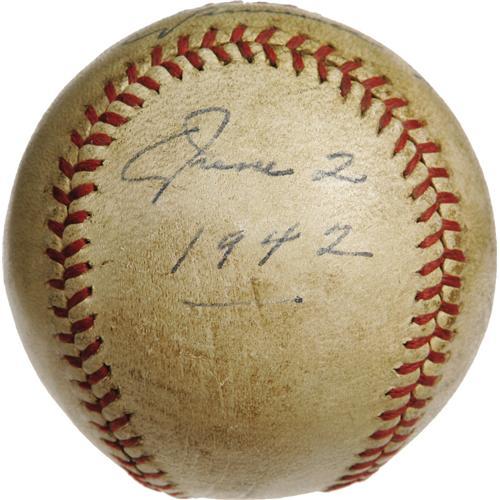 <B>1942 Jimmie Foxx Single Signed Baseball.</B></I> Unique solo sphere was autographed the day after the Hall of Fame slugger was selected off waivers by the Chicago Cubs from the Boston Red Sox franchise he'd called home since leaving Connie Mack at the close of the 1935 season. Foxx' 9+/10 sweet spot signature on this OAL (Harridge) ball is framed by top and bottom side panel writing in the slugger's hand that reads, "Tom, you are a grand guy," and "June 2, 1942." The circumstances lead us to wonder if "Tom" might be Hall of Fame Red Sox executive Tom Yawkey, and the use of an American League ball further suggests a farewell gift in Boston rather than a greeting in his new National League home. Regardless, one will be very hard-pressed to find a bolder specimen from this early powerhouse. Ball is moderately toned and appears to exhibit game use, very possibly from Foxx' final appearance in a Red Sox uniform. While these thoughts of provenance are purely conjecture, the spectacular quality of this rare single most assuredly is not. <I>LOA from James Spence Authentication.</B></I><BR><BR><b>Shipping:</b> Balls, Pucks, etc., Small (<a target="_blank" href="http://www.heritageauctions.com/common/shipping.php">view shipping information</a>)