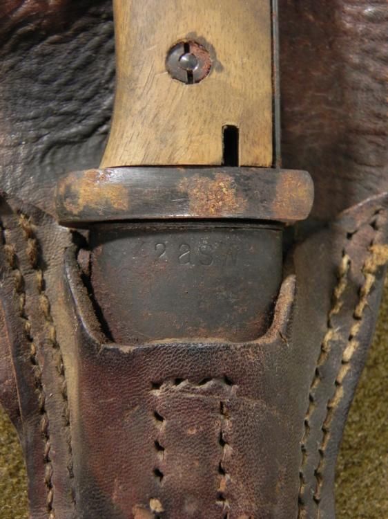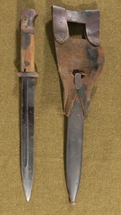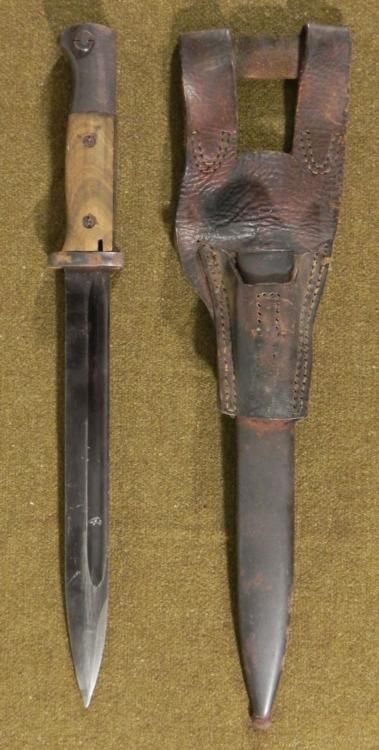 1942 K98 NAZI COMBAT BAYONET-MATCHING # & MAKER WITH RE-WORKED FROG FROM COMBAT * GET ORIGINAL NAZI COMBAT BAYONET. MATCHING NUMBERS AND MAKER/DATE ON SCABBARD AND BLADE--"42 ASW" AND "0119"-VERY UNIQUE RETRO-FITTED LEATHER FROG FROM FIELD COMBAT. HAS 2 STRAPS. SHOWS RUST AND AGE-BLADE NICE=POINT DINGED-GREAT VET BRING-BACK *