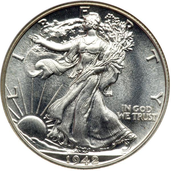 1942 Liberty Walking Half Dollar. NGC graded Proof 68. A nice white Proof. We have handled a fair number of 68-quality Walking Liberty half dollars, business strikes and Proofs, but none come as close to perfection as this pristine example. Both sides are smoothly reflective with luster. The surfaces radiate careening mirror effects far in advance of most others. Fully struck in all areas with pinpoint detailing on the head and skirt lines, as well as feather detail. Pop 161; 4 finer in 69.