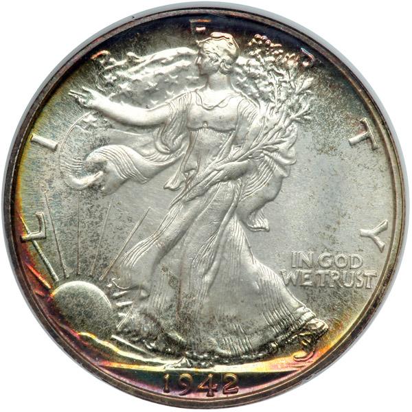 1942. NGC graded Proof 68 CAC Approved. A beauty with wonderful rainbow toning about the edges on both sides. In an old holder. Pop 150; 22 finer .