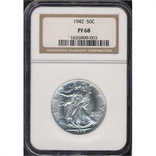 <b>1942 Liberty Walking Half Dollar. NGC graded Proof 68.</b> An incredible gem of the finest order and from the same source as the 1939 Proof 68 example offered a moment ago. Glowing fresh mirrors play host to robust brilliance capped off by natural shades of silvery freshness with no toning left over from the cellophane sleeve in which it was shipped by the Mint <b>(PCGS # 6642)</b> <i>