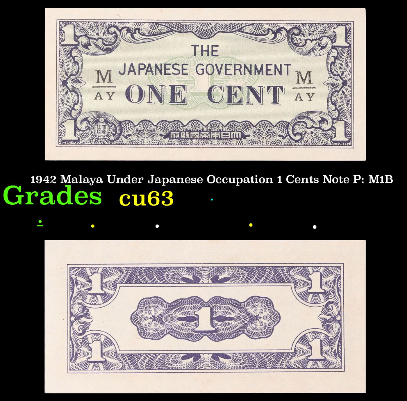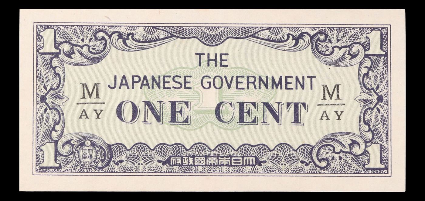1942 Malaya Under Japanese Occupation 1 Cents Note P: M1B Grades Select CU. Japanese invasion money, officially known as Southern Development Bank Notes (Japanese: ??????? Dai T?-A Sens? gunpy?, "Greater East Asia War military scrip"), was currency issued by the Japanese Military Authority as a replacement for local currency after the conquest of colonies and other states in World War II. Japan printed this currency for many countries, including Malaysia, Singapore, North Borneo, Sarawak, Burma, Brunei, and several Oceania territories controlled by Australia.