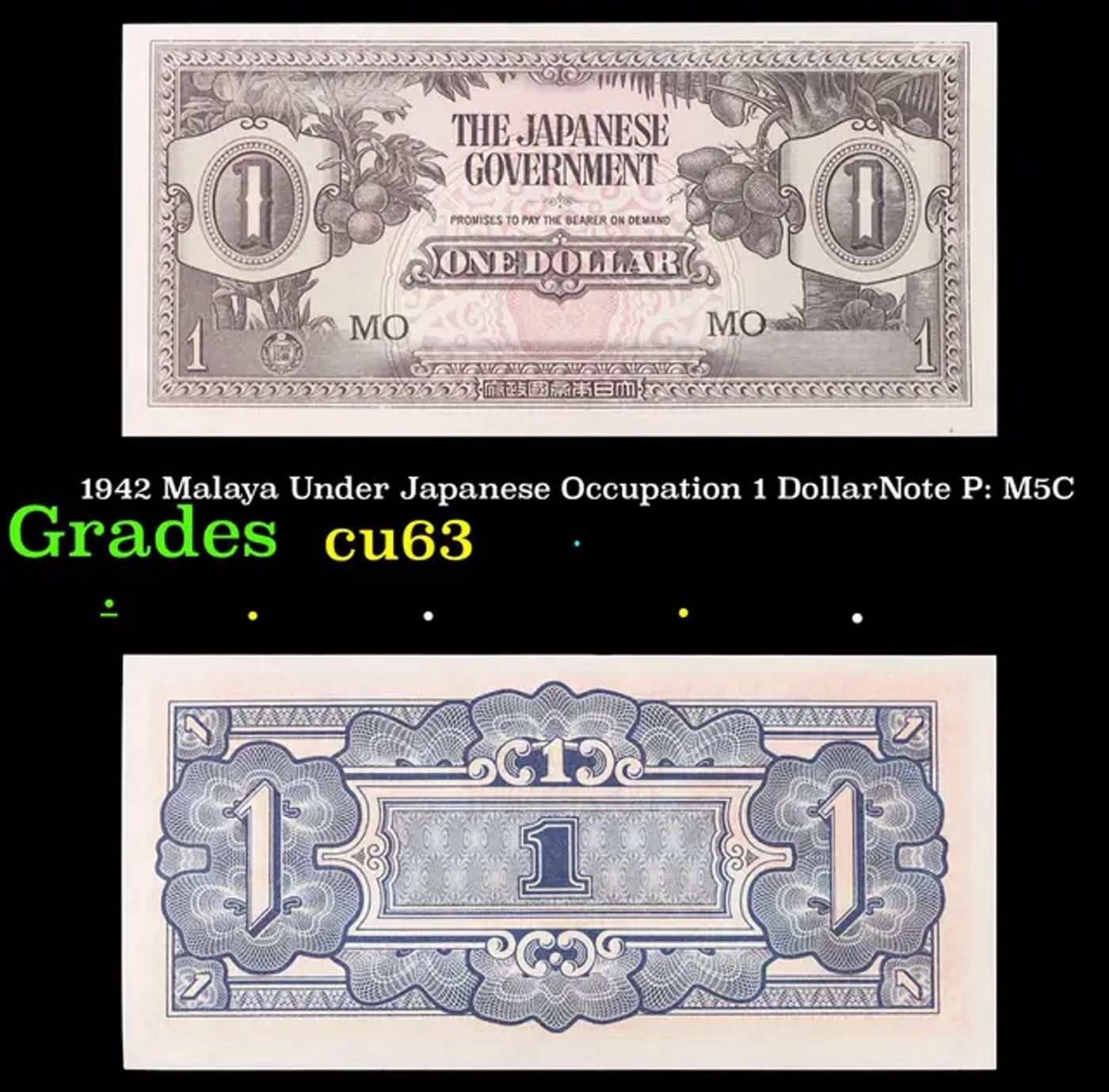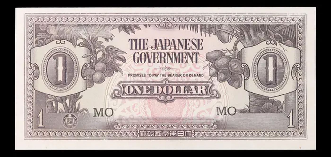 1942 Malaya Under Japanese Occupation 1 DollarNote P: M5C Grades Select CU. Japanese invasion money, officially known as Southern Development Bank Notes (Japanese: ??????? Dai T?-A Sens? gunpy?, "Greater East Asia War military scrip"), was currency issued by the Japanese Military Authority as a replacement for local currency after the conquest of colonies and other states in World War II. Japan printed this currency for many countries, including Malaysia, Singapore, North Borneo, Sarawak, Burma, Brunei, and several Oceania territories controlled by Australia.