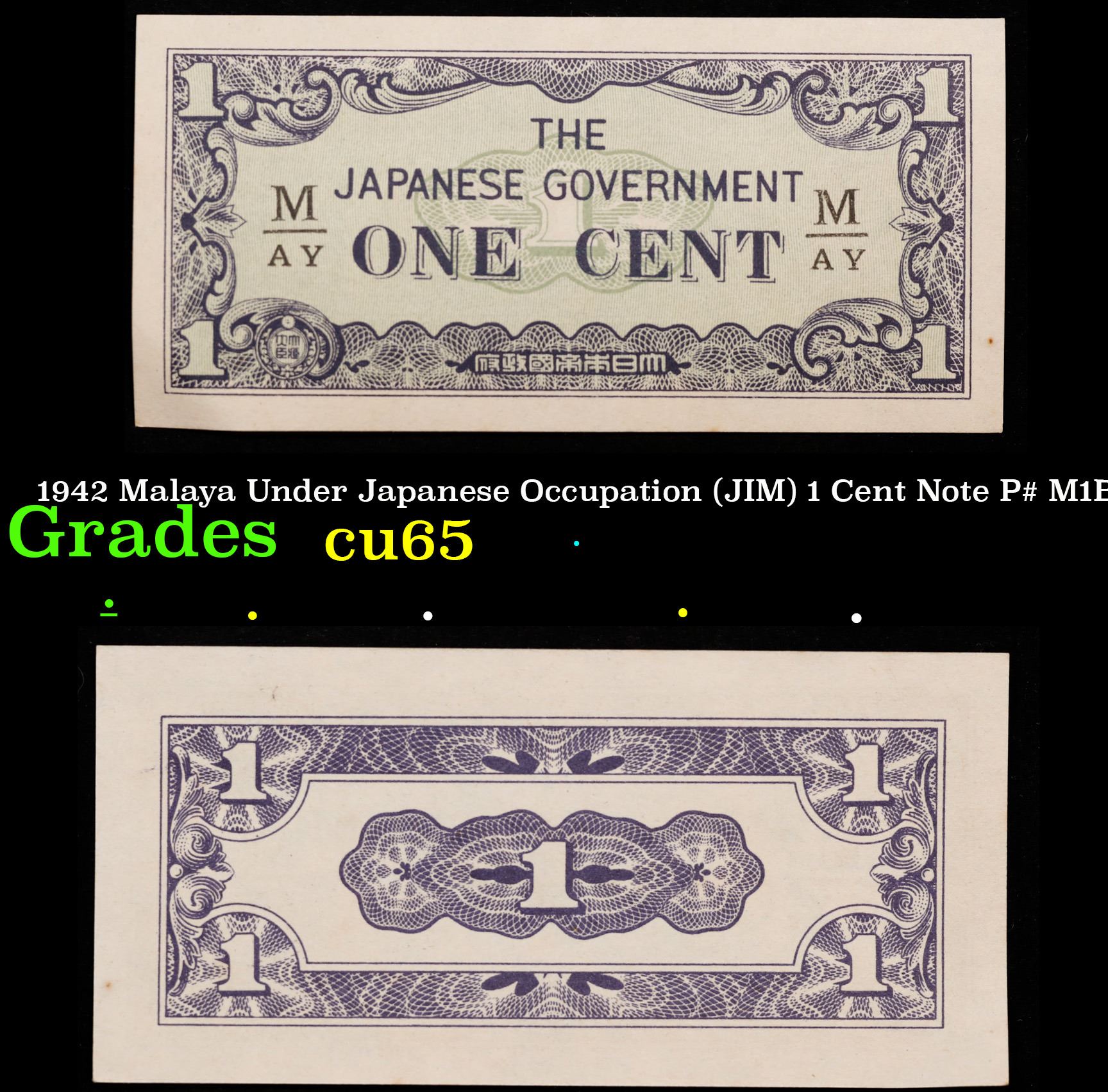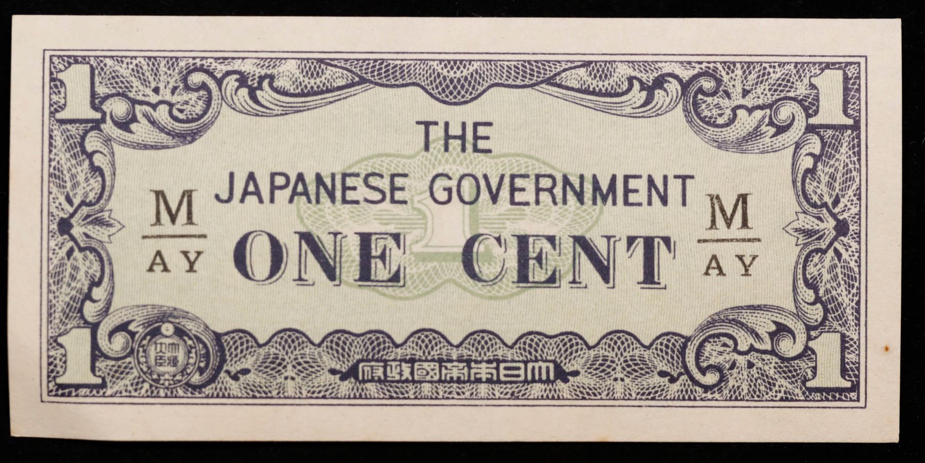1942 Malaya Under Japanese Occupation (JIM) 1 Cent Note P# M1B Grades Gem CU. After Japanese forces occupied Malaya early in 1942, they introduced new currency notes. Because the $10 note carried a picture of a banana plant, the wartime currency was referred to as banana money. For the first two years of the occupation, the Japanese maintained monetary discipline and kept circulation of this currency under control. However, with the country’s trading economy at a standstill, there was little to tax and, in order to fund the civil administration and purchase supplies for the military, the Japanese began printing more and more money. In December 1940, the active circulation of currency in Malaya was 120 million dollars. By the middle of 1945, the Japanese may have printed 4,000 million dollars, and the active circulation was 30 times greater than before the war. The predictable result was hyperinflation.
