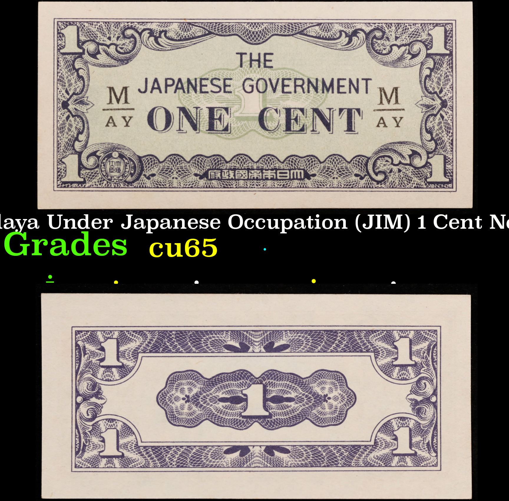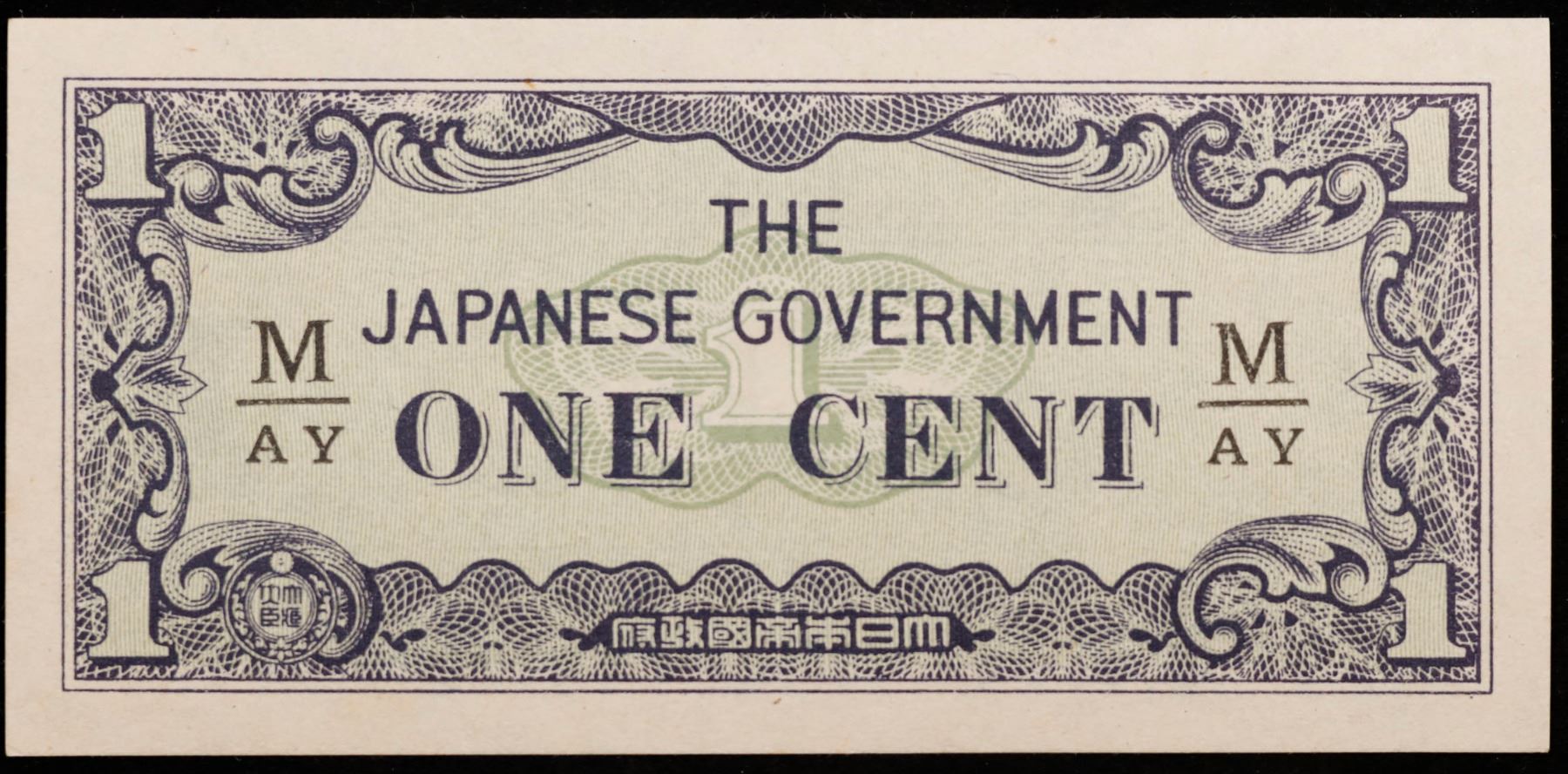 1942 Malaya Under Japanese Occupation (JIM) 1 Cent Note P# M1B Grades Gem CU. After Japanese forces occupied Malaya early in 1942, they introduced new currency notes. Because the $10 note carried a picture of a banana plant, the wartime currency was referred to as banana money. For the first two years of the occupation, the Japanese maintained monetary discipline and kept circulation of this currency under control. However, with the country’s trading economy at a standstill, there was little to tax and, in order to fund the civil administration and purchase supplies for the military, the Japanese began printing more and more money. In December 1940, the active circulation of currency in Malaya was 120 million dollars. By the middle of 1945, the Japanese may have printed 4,000 million dollars, and the active circulation was 30 times greater than before the war. The predictable result was hyperinflation.