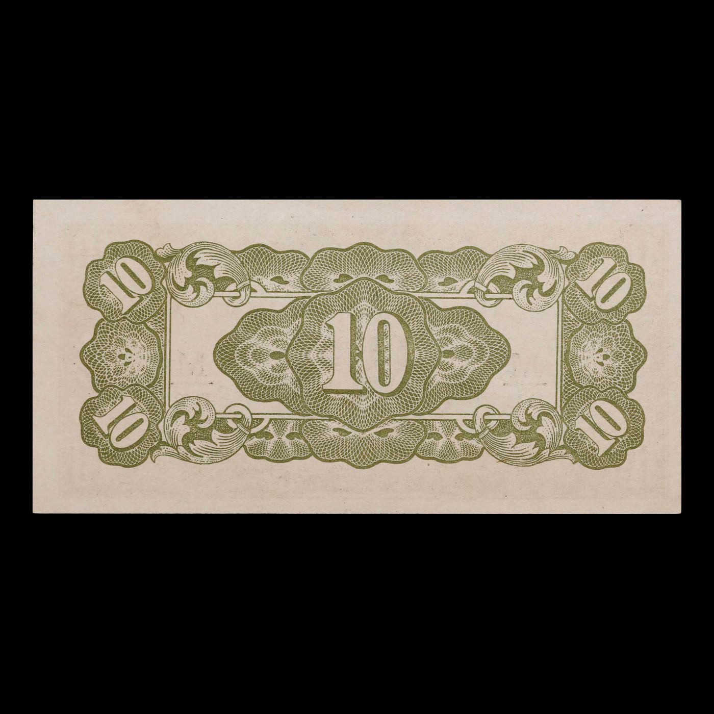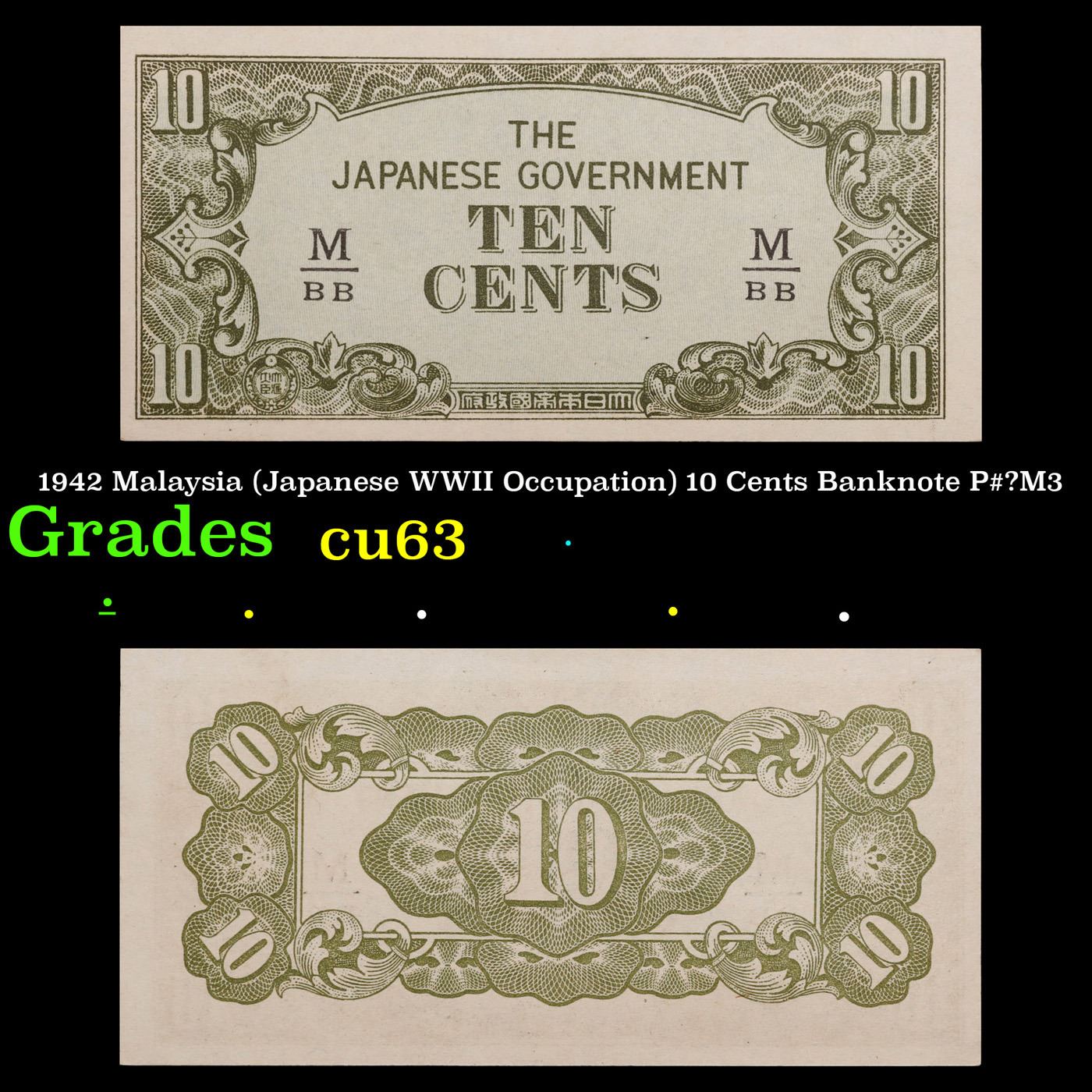 1942 Malaysia (Japanese WWII Occupation) 10 Cents Banknote P#?M3 Grades Select CU. Japanese invasion money, officially known as Southern Development Bank Notes (Japanese: ??????? Dai T?-A Sens? gunpy?, "Greater East Asia War military scrip"), was currency issued by the Japanese Military Authority as a replacement for local currency after the conquest of colonies and other states in World War II. Japan printed this currency for many countries, including Malaysia, Singapore, North Borneo, Sarawak, Burma, Brunei, and several Oceania territories controlled by Australia. Some Japanese invasion notes are actually counterfeits produced by the American Office of Strategic Services or the British Special Operations Executive, meant to flood and destabilize the economy in the occupied areas, sometimes also including propaganda printed on the notes themselves.