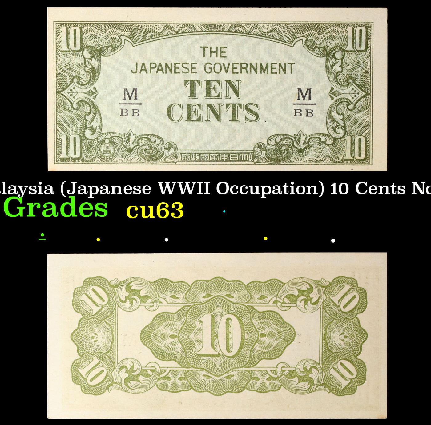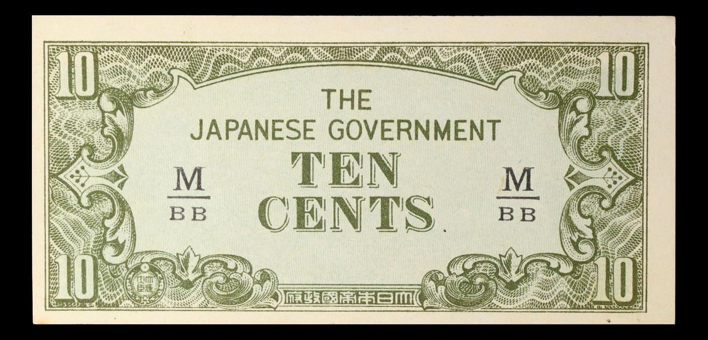 1942 Malaysia (Japanese WWII Occupation) 10 Cents Note P#?M3b Grades Select CU. Japanese invasion money, officially known as Southern Development Bank Notes (Japanese: ??????? Dai T?-A Sens? gunpy?, "Greater East Asia War military scrip"), was currency issued by the Japanese Military Authority as a replacement for local currency after the conquest of colonies and other states in World War II. Japan printed this currency for many countries, including Malaysia, Singapore, North Borneo, Sarawak, Burma, Brunei, and several Oceania territories controlled by Australia. Some Japanese invasion notes are actually counterfeits produced by the American Office of Strategic Services or the British Special Operations Executive, meant to flood and destabilize the economy in the occupied areas, sometimes also including propaganda printed on the notes themselves.