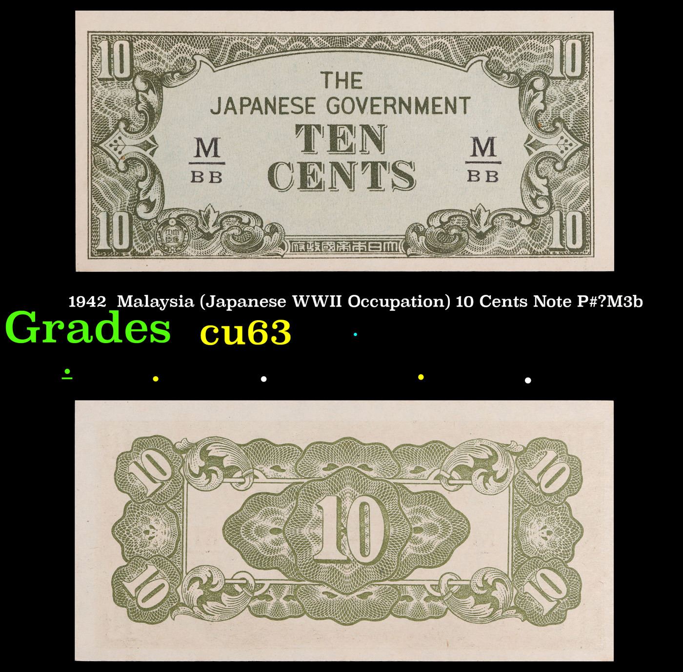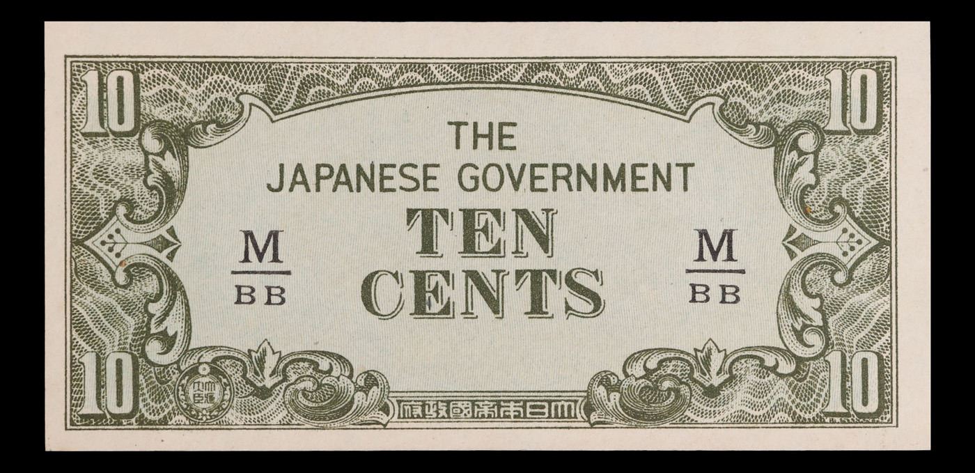 1942 Malaysia (Japanese WWII Occupation) 10 Cents Note P#_M3b Grades Select CU. Japanese invasion money, officially known as Southern Development Bank Notes (Japanese: _______ Dai T_-A Sens_ gunpy_, "Greater East Asia War military scrip"), was currency issued by the Japanese Military Authority as a replacement for local currency after the conquest of colonies and other states in World War II. Japan printed this currency for many countries, including Malaysia, Singapore, North Borneo, Sarawak, Burma, Brunei, and several Oceania territories controlled by Australia. Some Japanese invasion notes are actually counterfeits produced by the American Office of Strategic Services or the British Special Operations Executive, meant to flood and destabilize the economy in the occupied areas, sometimes also including propaganda printed on the notes themselves.