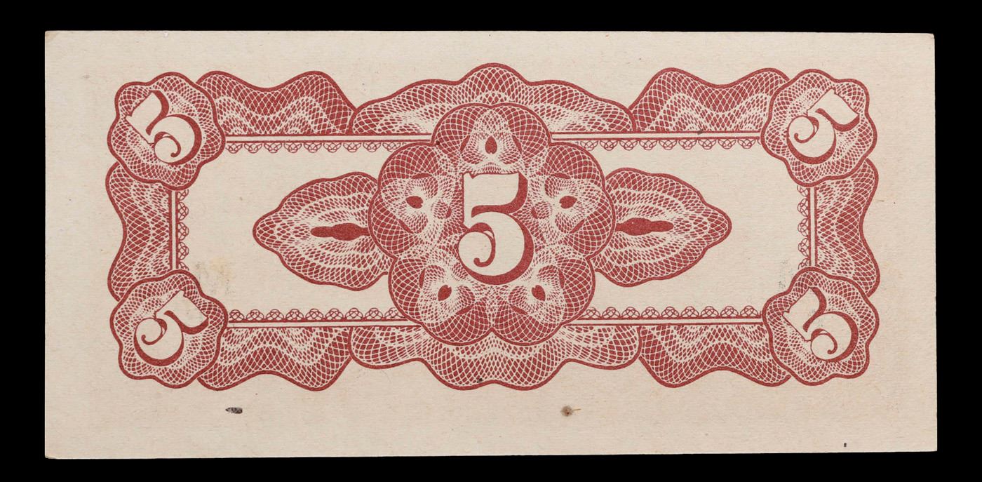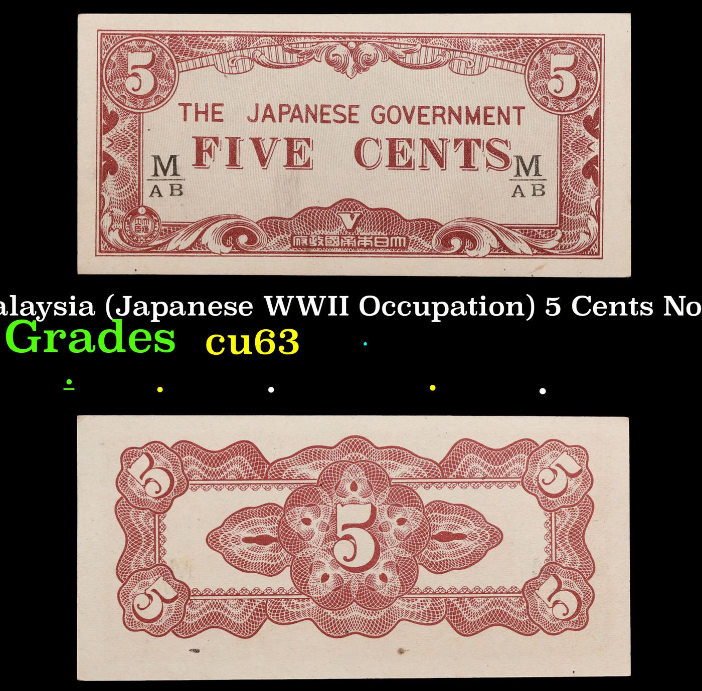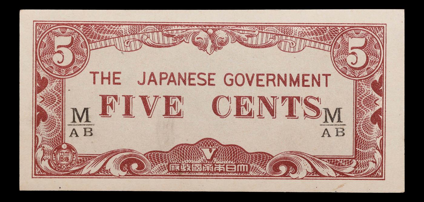 1942 Malaysia (Japanese WWII Occupation) 5 Cents Note P#?M2b Grades Select CU. Japanese invasion money, officially known as Southern Development Bank Notes (Japanese: ??????? Dai T?-A Sens? gunpy?, "Greater East Asia War military scrip"), was currency issued by the Japanese Military Authority as a replacement for local currency after the conquest of colonies and other states in World War II. Japan printed this currency for many countries, including Malaysia, Singapore, North Borneo, Sarawak, Burma, Brunei, and several Oceania territories controlled by Australia. Some Japanese invasion notes are actually counterfeits produced by the American Office of Strategic Services or the British Special Operations Executive, meant to flood and destabilize the economy in the occupied areas, sometimes also including propaganda printed on the notes themselves.