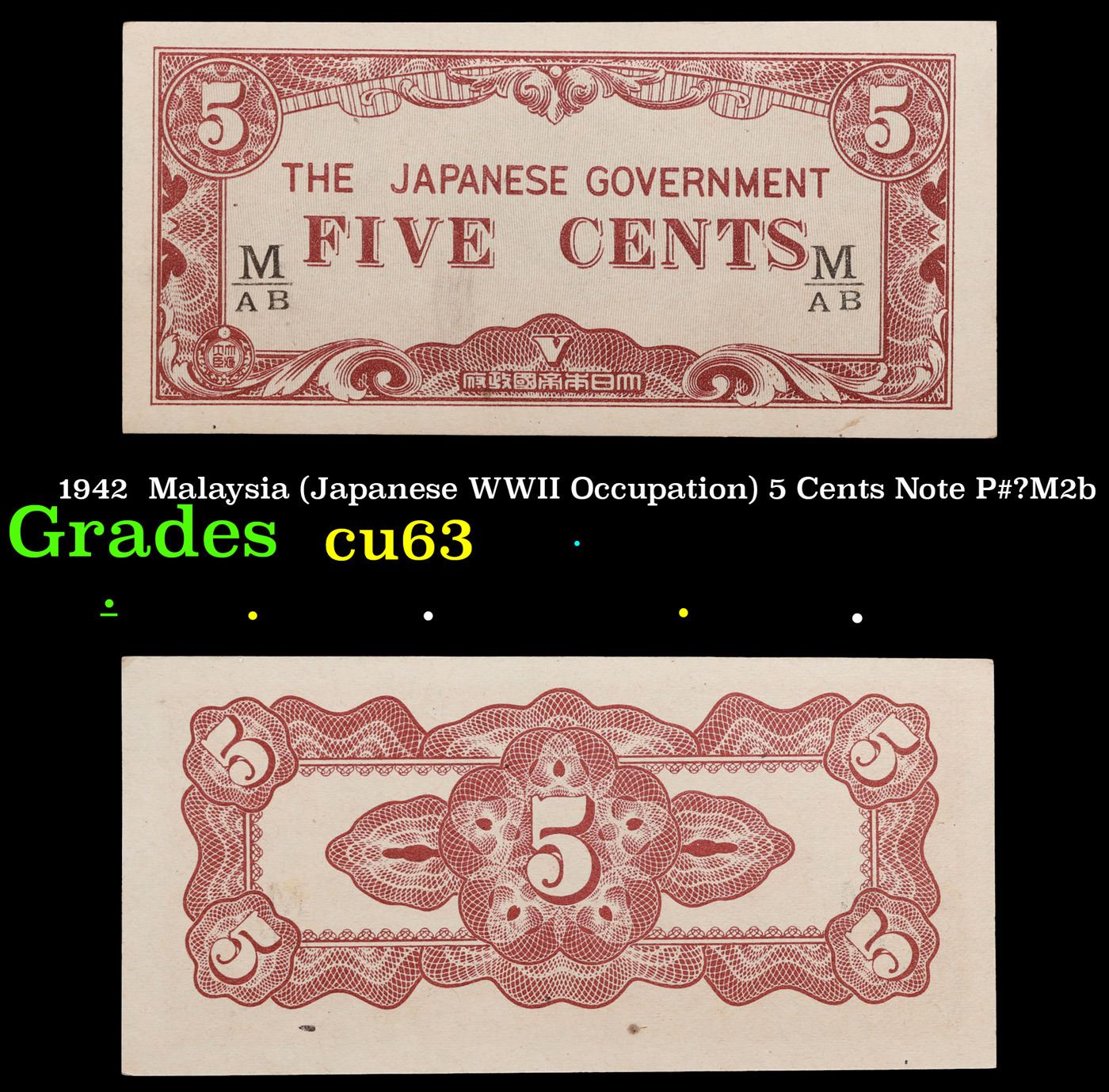 1942 Malaysia (Japanese WWII Occupation) 5 Cents Note P#?M2b Grades Select CU. Japanese invasion money, officially known as Southern Development Bank Notes (Japanese: ??????? Dai T?-A Sens? gunpy?, "Greater East Asia War military scrip"), was currency issued by the Japanese Military Authority as a replacement for local currency after the conquest of colonies and other states in World War II. Japan printed this currency for many countries, including Malaysia, Singapore, North Borneo, Sarawak, Burma, Brunei, and several Oceania territories controlled by Australia. Some Japanese invasion notes are actually counterfeits produced by the American Office of Strategic Services or the British Special Operations Executive, meant to flood and destabilize the economy in the occupied areas, sometimes also including propaganda printed on the notes themselves.