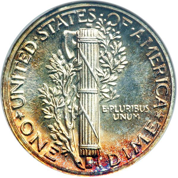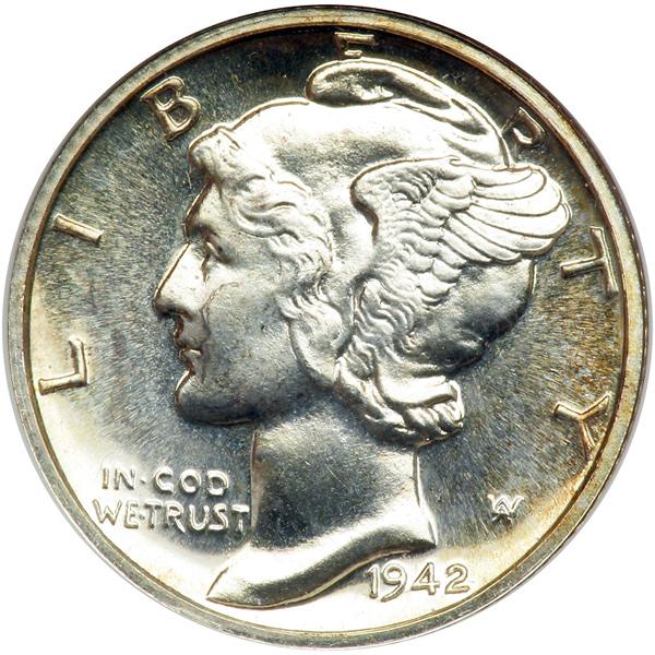 1942 Mercury Dime. ANACS graded Proof 67 Full Split Bands. The obverse is untoned while the reverse exhibits a touch of golden and russet hues.