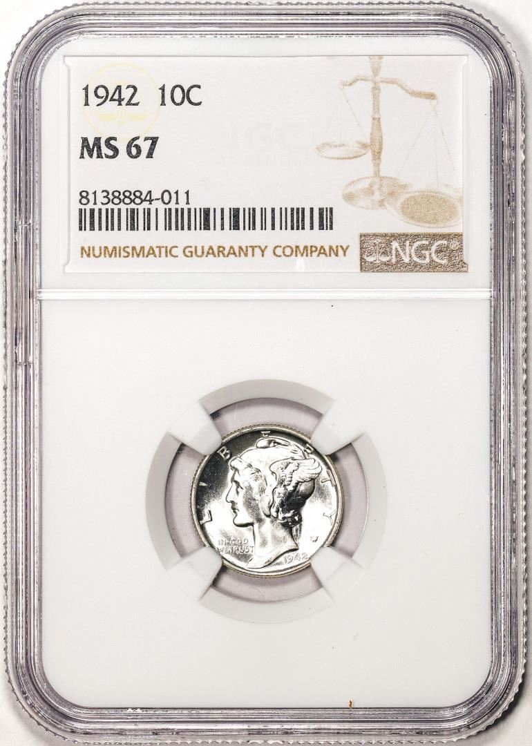 One 1942 Mercury Dime Coin NGC MS67. NGC Certified.