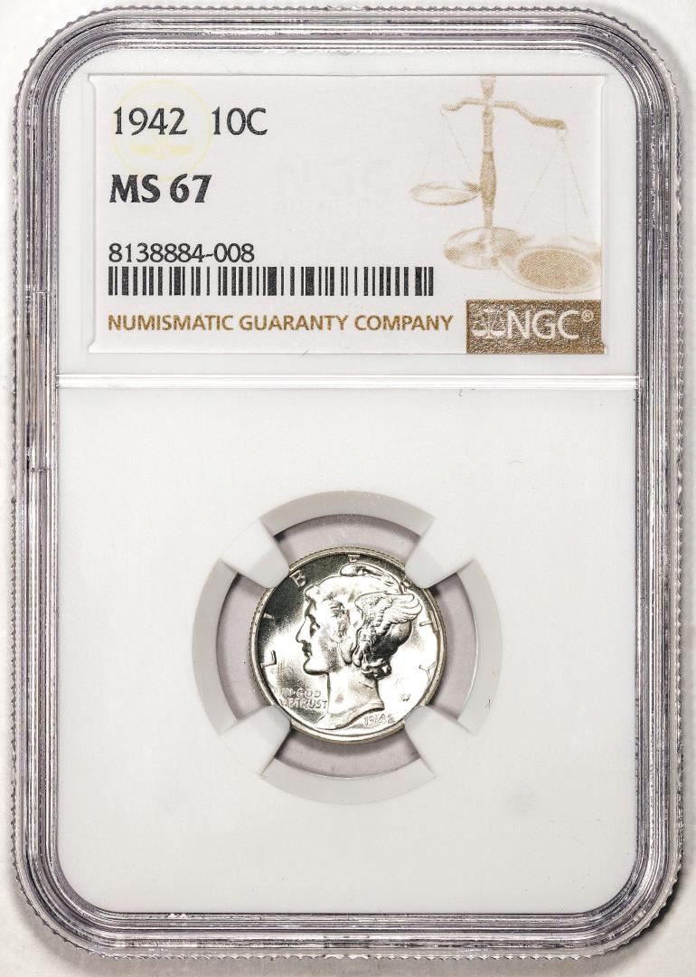 One 1942 Mercury Dime Coin NGC MS67. NGC Certified.