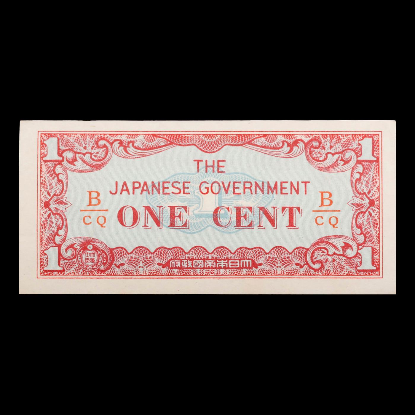 1942 Myanmar (Japanese WWII Occupation) 1 Cent Banknote P#_9 Grades Choice AU/BU Slider. Japanese invasion money, officially known as Southern Development Bank Notes (Japanese: _______ Dai T_-A Sens_ gunpy_, "Greater East Asia War military scrip"), was currency issued by the Japanese Military Authority as a replacement for local currency after the conquest of colonies and other states in World War II. Japan printed this currency for many countries, including Malaysia, Singapore, North Borneo, Sarawak, Burma, Brunei, and several Oceania territories controlled by Australia. Some Japanese invasion notes are actually counterfeits produced by the American Office of Strategic Services or the British Special Operations Executive, meant to flood and destabilize the economy in the occupied areas, sometimes also including propaganda printed on the notes themselves.