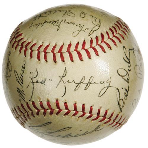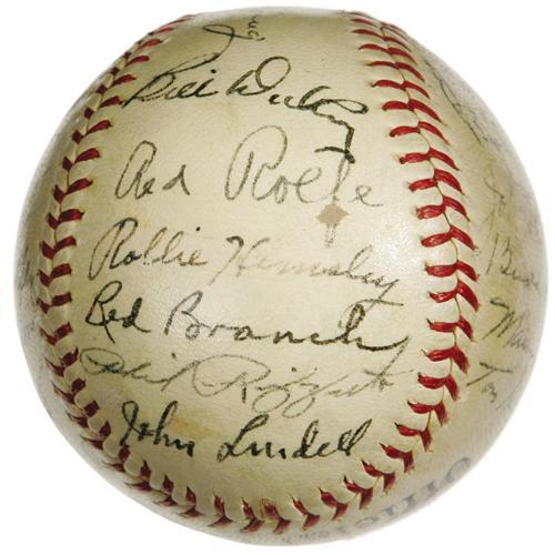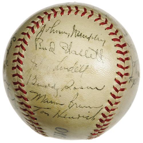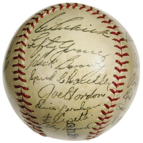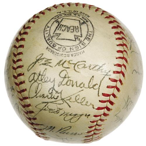 <B>1942 New York Yankees Team Signed Baseball.</B></I> Despite coming up short in the World Series this season, the 1942 Bombers' total of 103 victories represented the best record of the decade in the Bronx. Matching the quality of this powerhouse club is that of the sphere that documents it, with twenty-five of its twenty-six black fountain pen signatures rating 9/10 or better (John Lindell is 7/10). All the top stars are here: DiMaggio, Ruffing, Dickey, Rizzuto, Gomez, Henrich, Selkirk and Crosetti among them. Only McCarthy appears in clubhouse format. A thin layer of shellac has kept this "Reach Official League" ball in top form. The last season before the draft claimed much of the League's top talent. <I>LOA from PSA/DNA. LOA from James Spence Authentication.</B></I><BR><BR><b>Shipping:</b> Balls, Pucks, etc., Small (<a target="_blank" href="http://www.heritageauctions.com/common/shipping.php">view shipping information</a>)