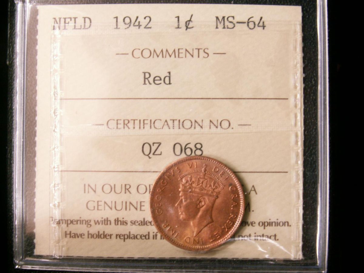 1942 Nfld 1¢ ICCS MS64RD. Lustrous and 75% red.