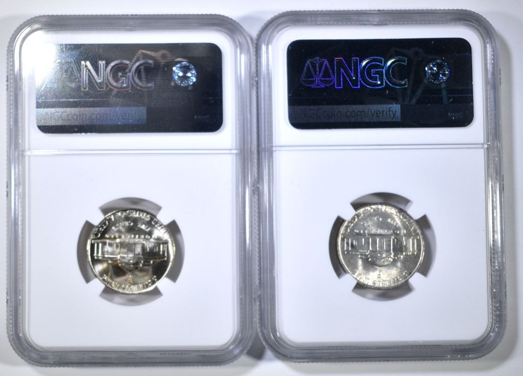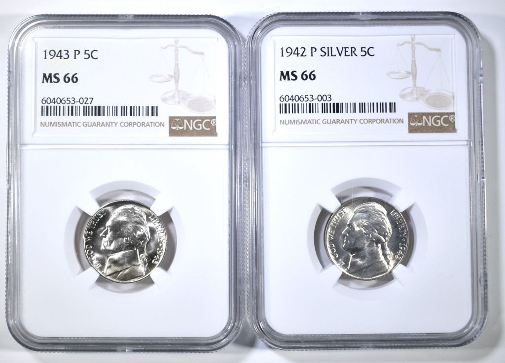 1942-P & 43-P SILVER JEFFERSON NICKELS, NGC MS-66