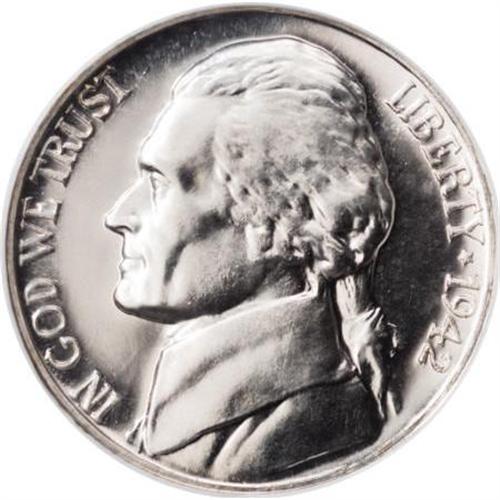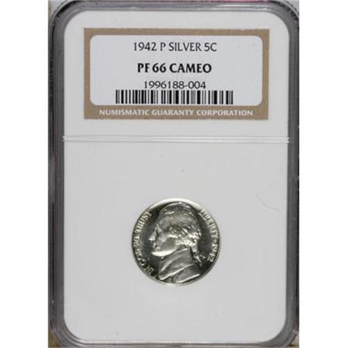 <B>1942-P 5C Type Two PR66 Cameo NGC.</B></I> Cameo proofs of the 1936 to 1942 era are extremely elusive. The present Premium Gem Cameo proof wartime silver alloy example is untoned silver-gray throughout, and sharply struck as expected, with considerable contrast provided by frosty devices against the deeply mirrored fields. Both sides are immaculately preserved. Census: 1 in 66 Cameo, 4 finer (7/07).<BR><BR><b>Shipping:</b> Coins & Currency (<a target="_blank" href="http://www.heritageauctions.com/common/shipping.php">view shipping information</a>)